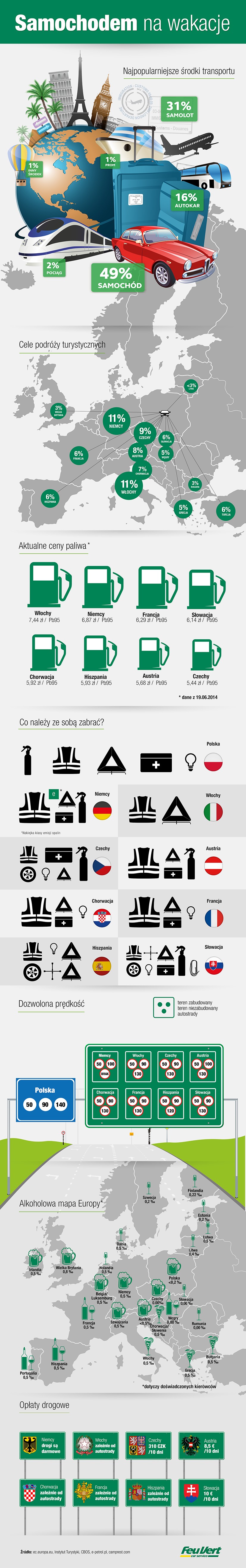Zestawienie cen paliw przygotowane przez Feu Vert pokazuje, że najwięcej płaci się we Włoszech, gdzie litr Pb095 kosztuje 7,38 zł, a najmniej w Czechach (5,43 zł). Z kolei w Czechach trzeba liczyć się z opłatą za drogi wynoszącą około 50 zł za 10 dni. W Niemczech nie ma żadnych opłat, a we Włoszech tylko część autostrad jest płatna.