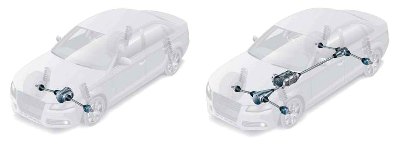 Z lewej: usytuowanie przegubów w standardowym współczesnym samochodzie osobowym, z prawej: przeguby i półosie w samochodzie z napędem 4x4