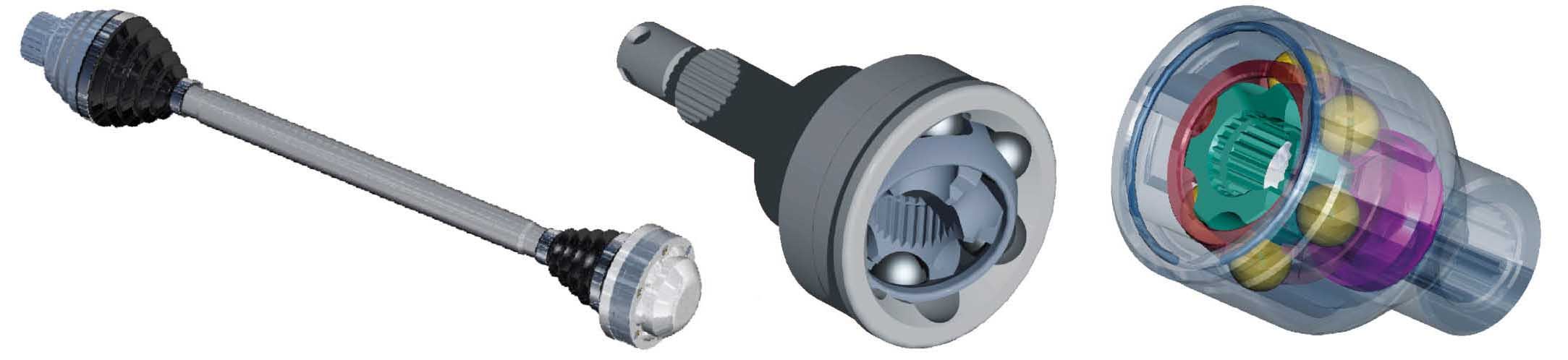 Od lewej: ompletna półoś z parą konstrukcyjnie zróżnicowanych przegubów, homokinetyczny przegub zewnętrzny (przy kole napędzanym i kierowanym) i homokinetyczny przegub wewnętrzny (przesuwny)