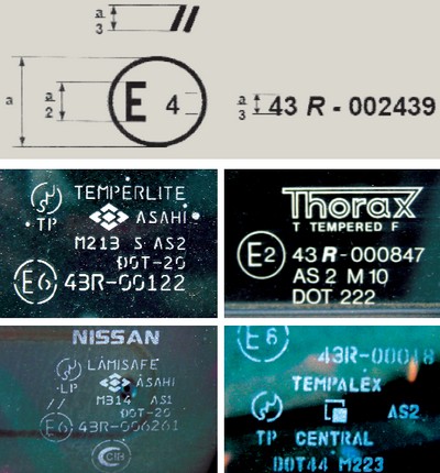 Poszczególne koncerny samochodowe stosują jednak jeszcze bardziej rygorystyczne wymagania, określone wnormach i warunkach technicznych, jak np.: WT Fiat 7D3320-30, GME 01 101, Renault 32-08-004, PSA Peugeot-CitroĎn D47 1165 oraz D45 1333 itp. Ponadto na szybach samochodowych mogą być umieszczane również inne informacje, takie jak: logo lub nazwa firmowa producenta, np. Pilkington, Saint-Gobain Sekurit, marka samochodu, np. Ford, Toyota, Fiat itp., a także angielskie określenie ich konstrukcji lub rodzaju zastosowanej obróbki, np. tampered (hartowane), laminated (klejone), przepuszczalność światła T>70% lub transmission min.70%, kod daty produkcji itp. Oznaczenie daty produkcji wiąże się z układem cyfr i kropek. Miejsce kropki przed lub za cyfrą wskazuje na miesiąc, cyfra – na rok produkcji. Oznaczenie DOT i CCC dotyczy zgodności produkowanej szyby z normą amerykańską i chińską (ChRL), o ile producent uzyskał potwierdzenie tej zgodności i odpowiedni numer identyfikacyjny. Dotyczy to producentów szyb na całym świecie i jest warunkiem zezwolenia w tych krajach na stosowania szyb w pojazdach dopuszczonych do ruchu. |