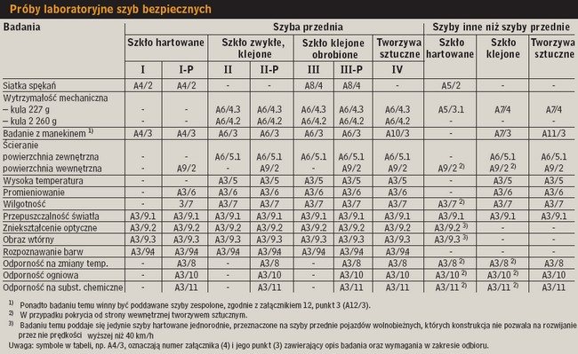 Podstawowe wymagania techniczne, związane z czynnym i biernym bezpieczeństwem transportu drogowego, określone są w Re- gulaminie homologacji nr 43 Europejskiej Komisji Gospodarczej ONZ, dostępnym w języku angielskim i francuskim na stronie internetowej: www.unece.org. Zalecenia dotyczące instalacji szyb bezpiecznych w pojazdach zawiera załącznik nr 21 wspomnianego Regulaminu. Dokumenty te stanowią podstawę tworzenia alfanumerycznych europejskich znaków homologacji, równoznacznych z oświadczeniem producenta szyby, że jej parametry techniczne są identyczne z parametrami produktu wzorcowego, przedstawionego do badań homologacyjnych. W oznaczeniach szyb polskich producentów występuje przydzielony im człon E20. Polska należy bowiem od 1992 roku do sygnatariuszy porozumienia o wzajemnym uznawaniu homologacji, którego elementem jest właśnie Regulamin nr 43.