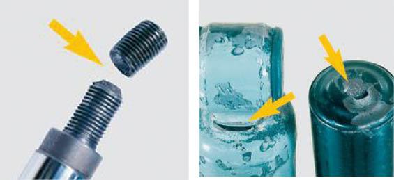 Użycie niewłaściwego narzędzia do przytrzymywania tłoczyska podczas montażu amortyzatora może powodować uszkodzenie jego gładkiej powierzchni. Chropowate miejsca rozrywają uszczelkę, co powoduje utratę oleju. Do montażu amortyzatorów należy więc stosować wyłącznie specjalne narzędzie przytrzymujące z miękkimi nakładkami roboczymi.