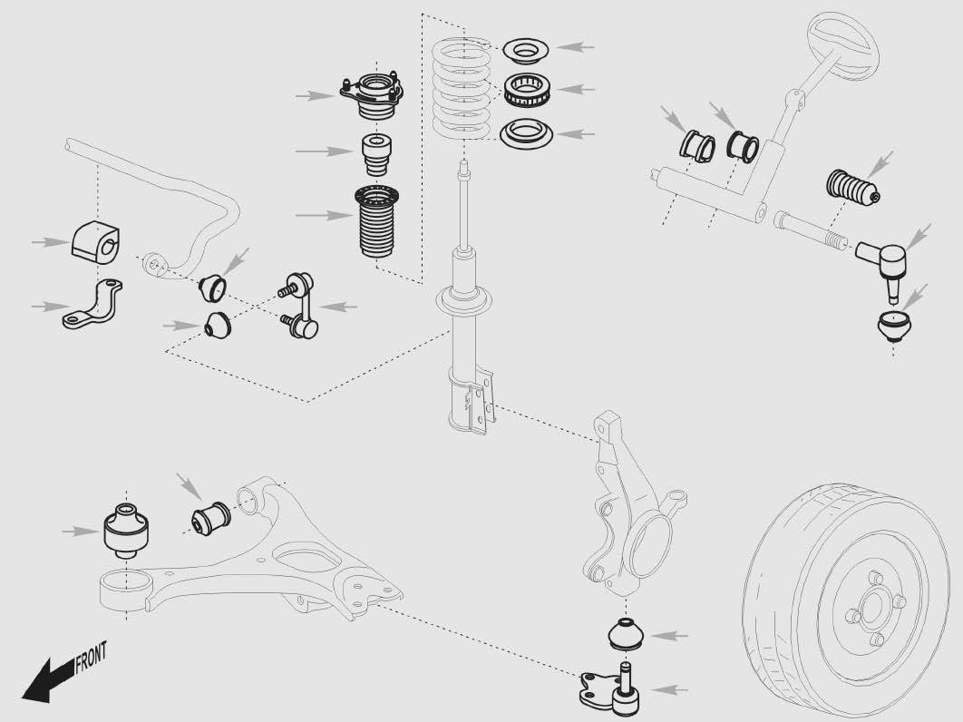 Typowe zawieszenie (przód i tył) popularnych modeli współczesnych samochodów, z zaznaczeniem elementów gumowych i metalowo-gumowych (kliknij miniatury, aby je powiększyć) |