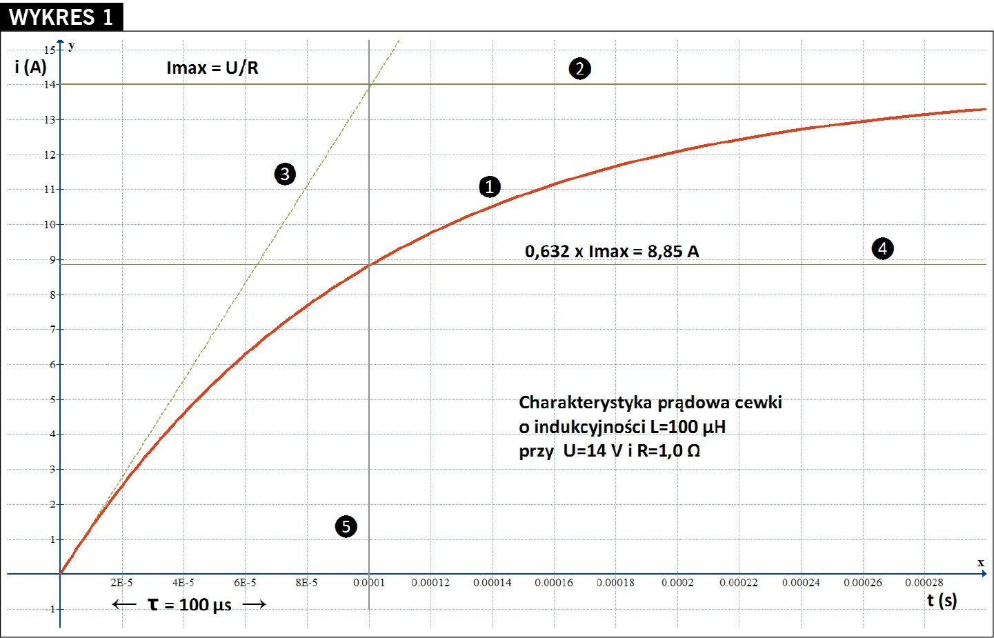 2 – poziom maksymalnego prądu płynącego przez cewkę dla ustalonych parametrów U/R (asymptota),