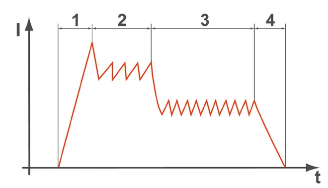 Fazy pracy zaworu elektromagnetycznego wtryskiwacza CR: 1 – faza Booster (podwyższenie napięcia), 2 – faza przyciągania zwory elektromagnesu, 3 – faza podtrzymania zwory w pozycji przyciągniętej, 4 – faza wyłączania