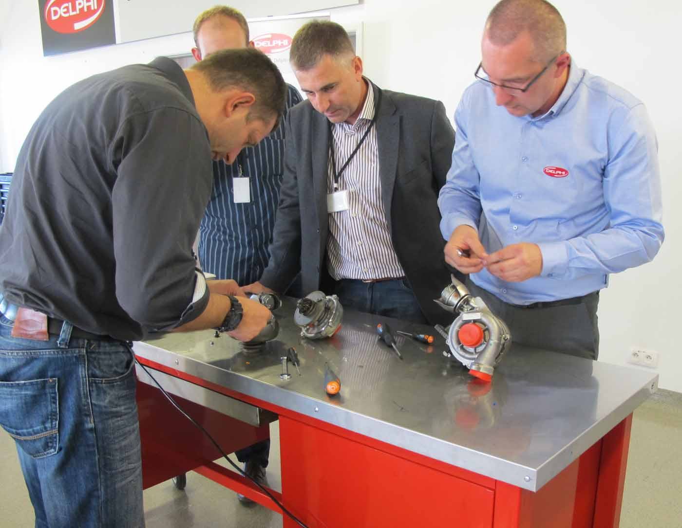 Kto czuje się mocny w samochodowej mechanice, niech rozłoży na elementy i potem zmontuje bez reszty nowoczesną turbosprężarkę. Chętnych nie było wielu, choć pod nadzorem Tomasza Hurta, odpowiedzialnego w Delphi za szkolenia, zadanie okazało się całkiem realne. Podobnych wyzwań przypada wiele na każdy metr kwadratowy tej treningowej hali, przygotowanej profesjonalnie do zajęć np. w zakresie: obsługi klimatyzacji, diagnostyki common rail, turbosprężarek i elektronicznych urządzeń diagnostycznych.