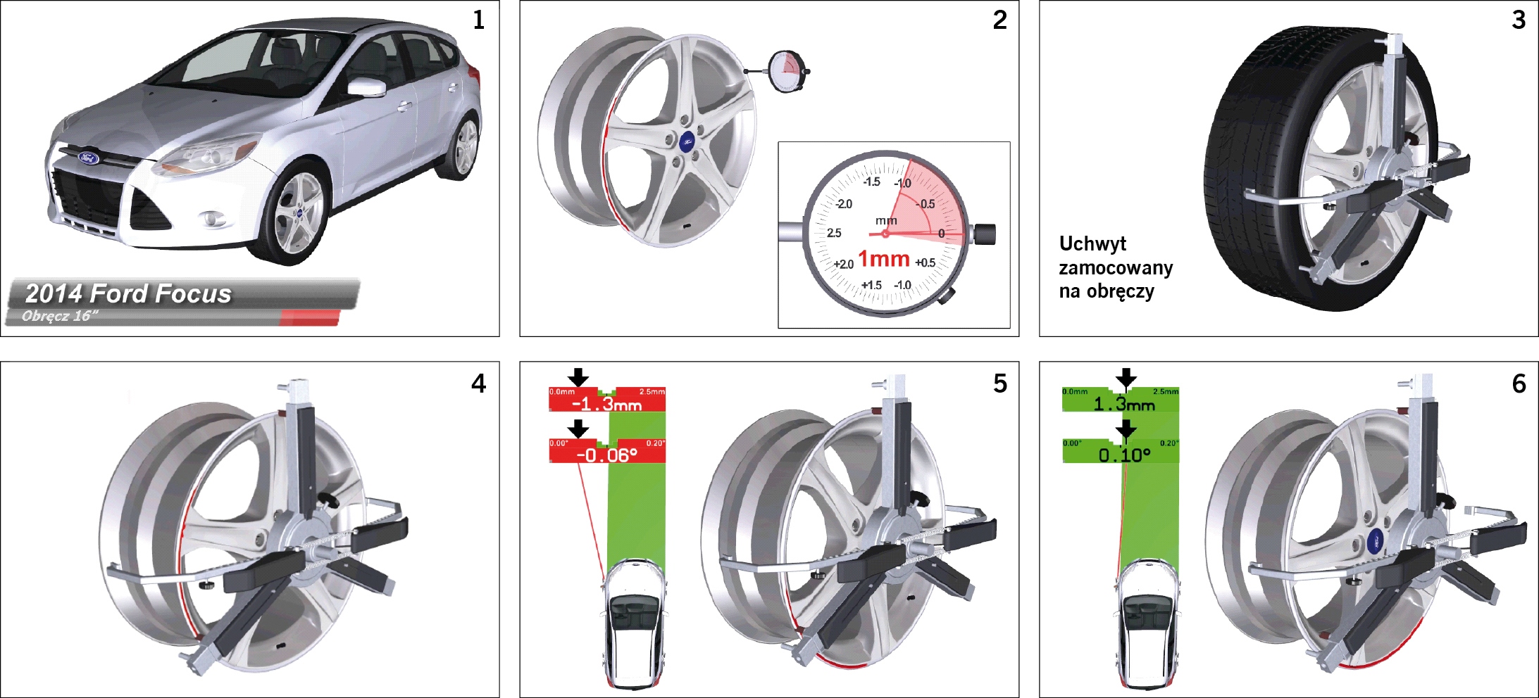 Praktyczne znaczenie kompensacji przeanalizujemy tutaj na przykładzie samochodu Ford Focus 2014 z 16-calowymi kołami (rys. 1). Samo zjawisko ewentualnego bicia osiowego obręczy można wykryć i zmierzyć różnymi przyrządami (dotykowymi i bezdotykowymi), w które są wyposażone zaawansowane wyważarki do kół. Na rys. 2 przedstawiono tradycyjny pomiar czujnikiem zegarowym. Zaznaczony na czerwono odcinek obwodu obręczy to strefa zaburzenia kształtu, czyli właśnie bicia. Dla ułatwienia dalszych obliczeń możemy przyjąć, że jego wartość maksymalna wynosi 1 mm.