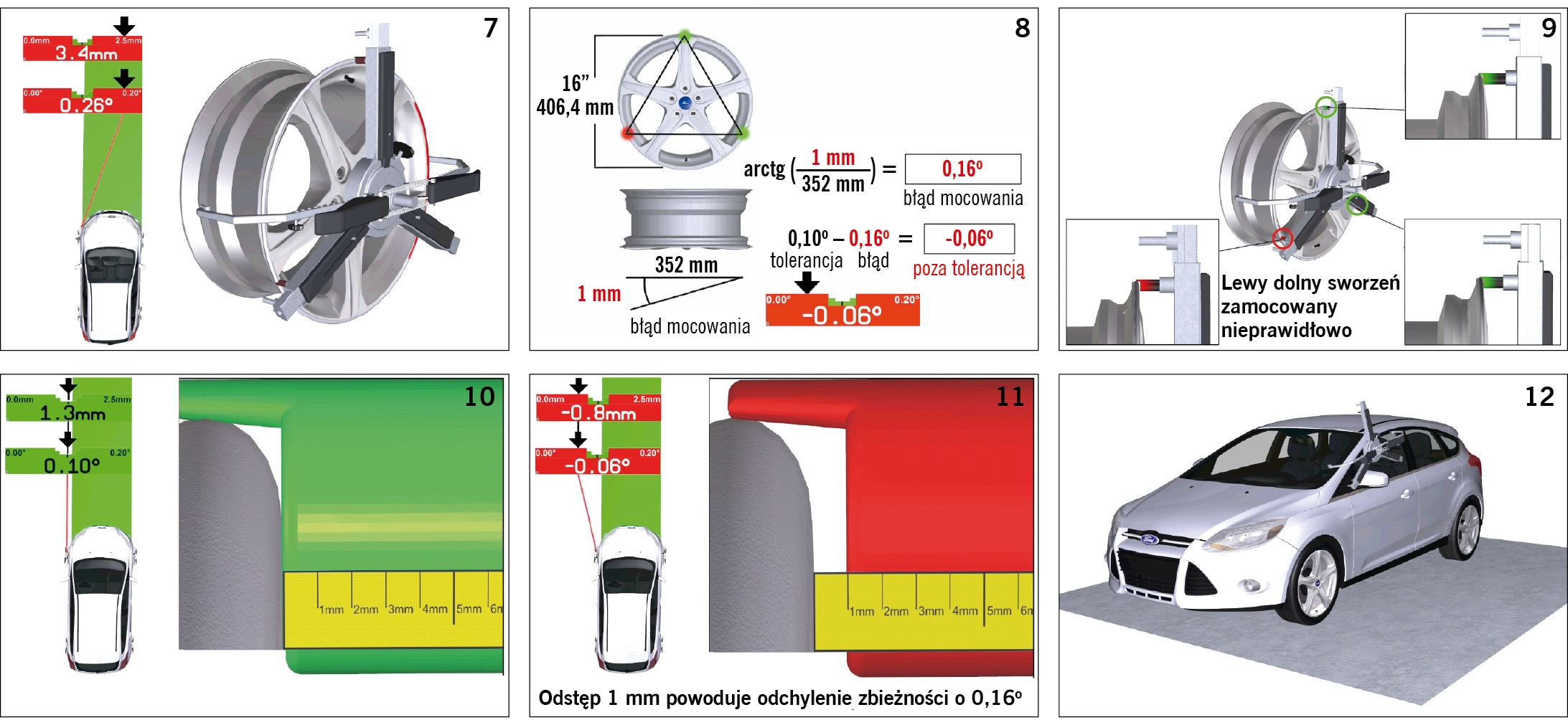 Następny przykład (rys. 9) pokazuje niedokładne założenie uchwytu głowicy na koło, przy którym jeden z trzech pazurów mocujących nie przylega właściwie do krawędzi obręczy. Wielkość tego błędu wynosi 1 mm, a na kolejnych ilustracjach (rys. 10, 11) widać, że takie zamocowanie powoduje błąd pomiaru zbieżności połówkowej o 0,16°, co może mieć podobne konsekwencje diagnostyczne jak na rys. 8, ponieważ dane wejściowe są w obu wypadkach identyczne.