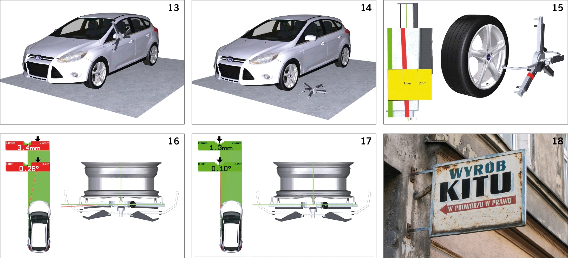 Sekwencja trzech kolejnych zdjęć (rys. 12, 13, 14) ilustruje fazy upadku uchwytu, który nie został zdjęty w porę z koła pojazdu opuszczającego stanowisko pomiarowe. Skutkiem takiego zdarzenia jest przeważnie odkształcenie co najmniej jednego ramienia mocującego, co wpływa na błąd następnych pomiarów (rys. 15, 16, 17), obliczony tu identycznie jak w poprzednich dwóch przykładach (rys. 8).