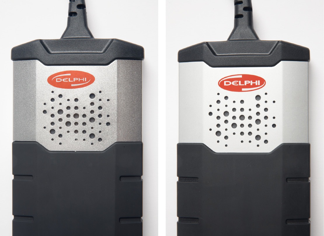 Warto zatem wiedzieć, jak odróżnić oryginalny produkt Delphi od jego taniej imitacji. Na ilustracji obok przedstawione są dwa produkty z logotypem Delphi, ale przyrząd po prawej stronie ma logo o niskiej jakości, niedbale umieszczone na obudowie.