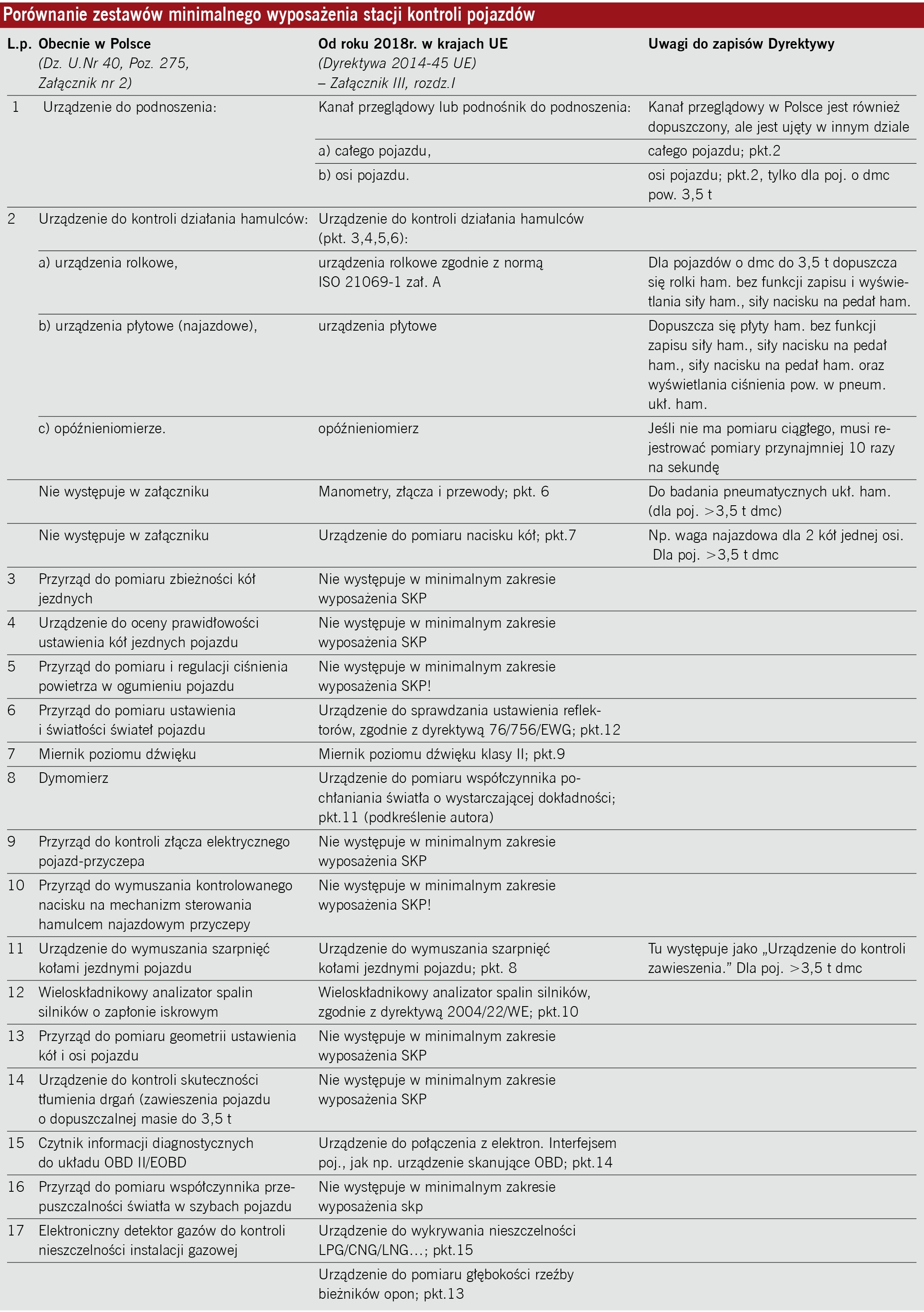To prawda, że w stosunkowo niewielu krajach sprawdza się amortyzatory lub geometrię podczas procedury dopuszczania pojazdów do ruchu. Zaniedbywanie tych badań wynika głównie z braku profesjonalnego sprzętu i niedostatecznych kwalifikacji diagnostów. Rozwój technologii pozwala jednak przezwyciężać te trudności, a prawodawstwo powinno temu sprzyjać poprzez sukcesywne podnoszenie stawianych wymogów. Tymczasem najnowsza unijna Dyrektywa zmierza wyraźnie w przeciwnym kierunku. Wystarczy uważnie przejrzeć załączoną tabelę, by przekonać się, iż przynajmniej w Polsce nakazywane Dyrektywą minimalne wyposażenie stacji kontroli pojazdów ma być w przyszłości znacząco uboższe niż obecnie.