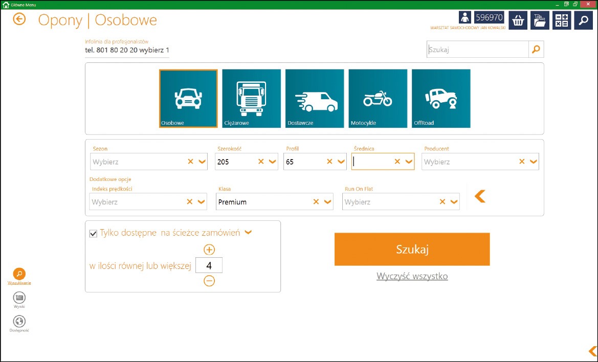 Zaawansowane wyszukiwanie opon, z automatycznie zawężającymi się kryteriami wyboru |