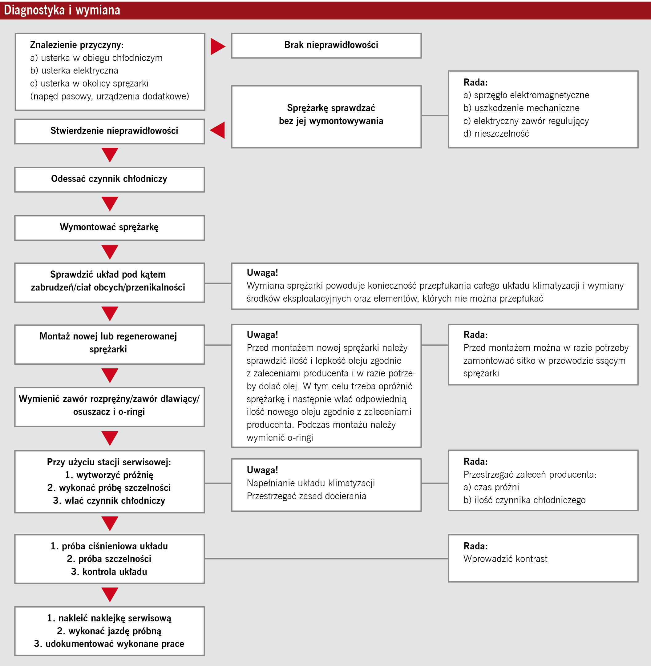 W przypadku wersji o zmiennej wydajności następnym krokiem jest sprawdzenie (najlepiej oscyloskopem) obecności impulsów sterujących. Jeśli impulsy się pojawiają i rezystancja cewki jest właściwa, to sprężarka nie wytwarza ciśnienia z powodu uszkodzeń mechanicznych i oczywiście wymaga wymiany lub specjalistycznej naprawy.
