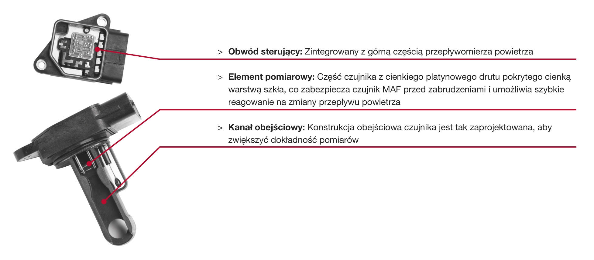 Część powietrza wlotowego z filtra powietrza jest kierowana do obszaru pomiarowego, gdzie mierzona jest masa powietrza dolotowego. Czujnik MAF typu hot wire reaguje na zmiany temperatury w elemencie grzejnym. Zmiany wartości oporności i natężenia prądu w elemencie grzejnym przepływomierza są przetwarzane na proporcjonalne napięcie w obwodzie sterowania, a następnie przesyłane do ECU w celu obliczenia masy powietrza dolotowego silnika.