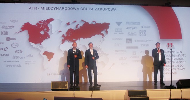 Gospodarze konferencji (od prawej: Robert Kierzek, Krzysztof Soszyński, Piotr Zamora) na tle mapy światowego zasięgu Grupy Zakupowej ATR, do której należy Inter Cars