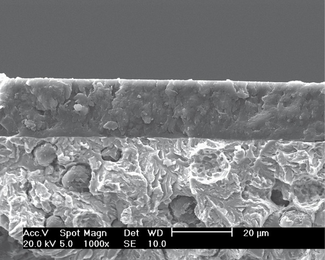 Przekrój powłoki węglowej na staliwnym podłożu widziany w mikroskopie elektronowym