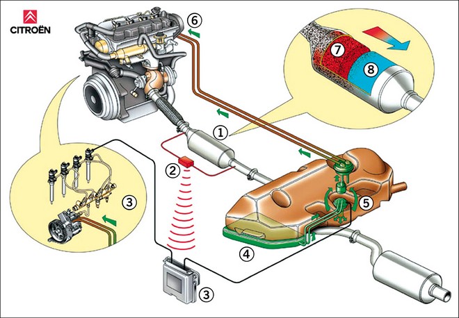 Rys. 1. Układ oczyszczania spalin pierwszej generacji z tzw. mokrym filtrem cząstek stałych stosowany przez firmę Citroën. 1 – zespół utleniającego konwertera katalitycznego (7) i filtra cząstek stałych bez pokrycia katalitycznego (8), 2 – czujnik różnicowy ciśnienia, 3 – sterownik silnika, 4 – zbiornik dodatku katalitycznego i dozownik (5) dodający go do paliwa, 6 – system wtryskowy Common Rail