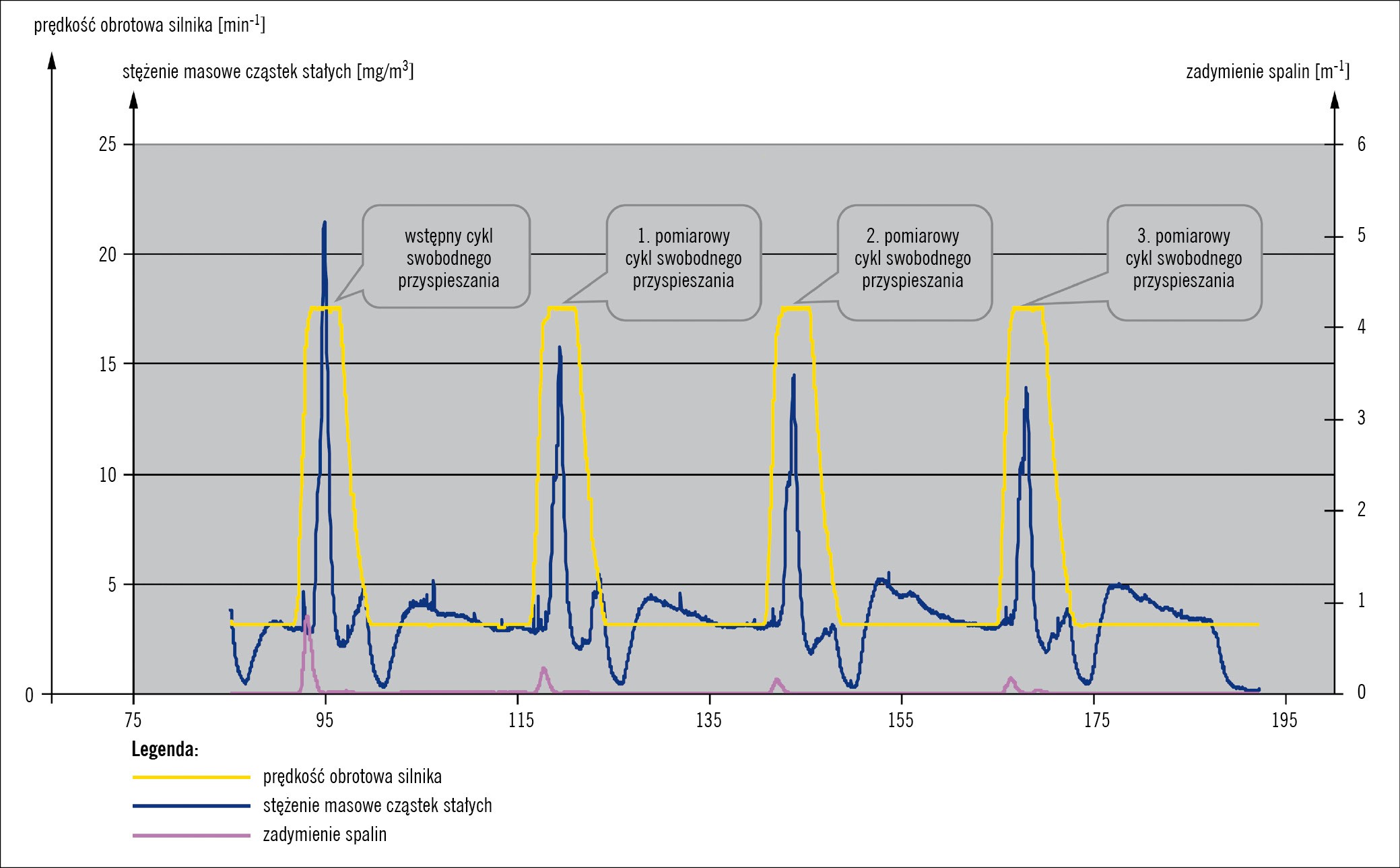 Rys. 3. Pomiar stężenia cząstek stałych i zadymienia spalin powszechnie obecnie używanym dymomierzem I generacji w trzech pomiarowych cyklach swobodnego przyspieszania obowiązujących w naszych stacjach kontroli pojazdów