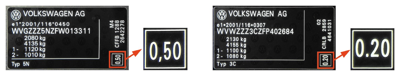 Rys. 7–8. Z lewej: informacja o wartości zadymienia spalin zmierzonej w ramach badań homologacyjnych wg normy Euro 5 dla nowego samochodu marki Volkswagen Tiguan 2,0 TDI o mocy 140 KM z roku 2014 r.