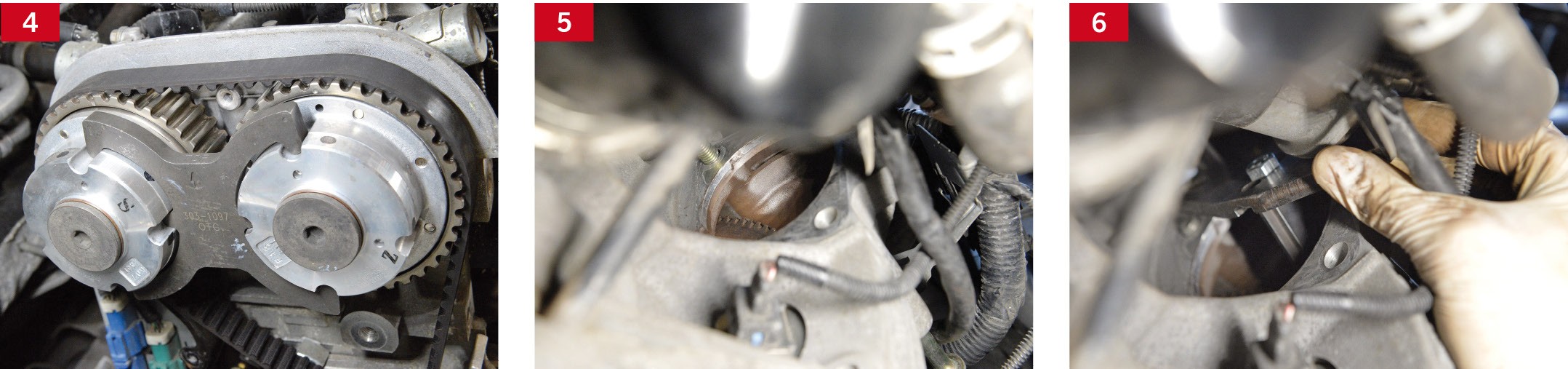 3. Zamontowanie blokady wałków rozrządu (OE 303-1097) na ich kołach zębatych, których znaczniki muszą przy tym pokrywać się z oznaczeniami na krawędzi blokady (fot. 4).