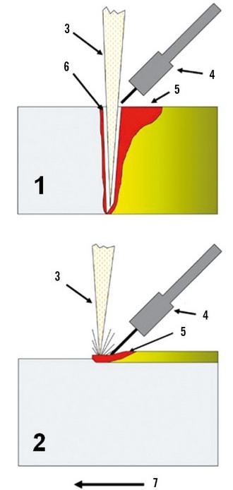 Z lewej: przebieg procesów hybrydowych: 1. spawanie, 2. napawanie, 3. wiązka laserowa, 4. głowica GMA, 5. stopiony materiał, 6. wtopienie, 7. kierunek ruchu. U góry: wykonana w jednym przejściu metodą hybrydową spoina (blacha ze stali drobnoziarnistej S690QL grubości 20 mm) |