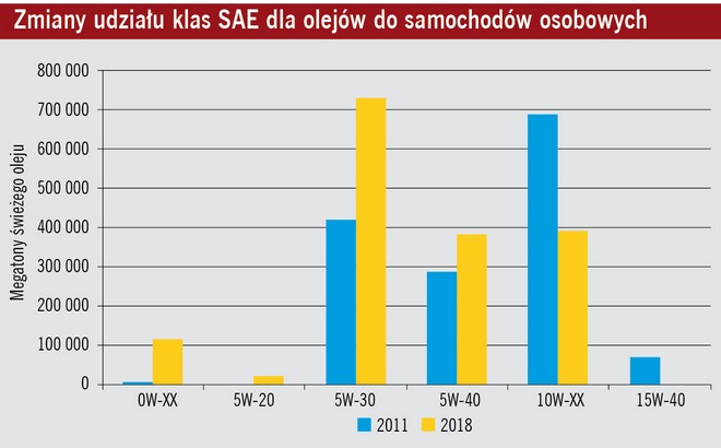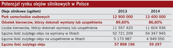 Według danych firmy Motodata z 2013 r. w zachodniej Europie ogólna sprzedaż olejów silnikowych spada mimo rosnącego parku eksploatowanych samochodów osobowych. W Polsce ich liczba osiągnęła już 13,4 mln egzemplarzy i nadal się zwiększa, a poziom zużycia olejów cechuje stagnacja. Zmieniają się rynkowe udziały poszczególnych dostawców, lecz łączne zakupy nie rosną. W przyszłości będą nawet maleć, ponieważ przyczyny tego regresu mają charakter techniczny. Składają się na nie: rzadsze wymiany oleju w cyklach serwisowych i coraz mniejsze pojemności samochodowych układów smarowania.