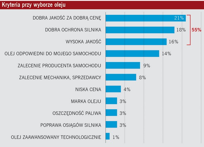 Powyższą strukturę kształtują, jak wynika z badań, preferencje ostatecznych konsumentów (właścicieli i użytkowników pojazdów) w zakresie kryteriów wyboru oleju. Najwyżej ceniona jest tutaj jakość (wymienia ją 55% ankietowanych respondentów), ale potwierdzające ją opinie kształtowane są przede wszystkim przez bezstronnych profesjonalistów. Dla kierowcy amatora są to bowiem zagadnienia zbyt skomplikowane i nie do końca jasne. Świadczą o tym choćby stosunkowo rzadkie, wręcz marginalne, głosy w ankietach, odwołujące się do aspektów technicznych produktów olejowych (oszczędność paliwa, szczególna ochrona silnika itp.). Rzadko też w tego rodzaju badaniach wymienia się konkretną olejową markę, choć preferowana jakość jest zwykle pośrednio z nią właśnie kojarzona.