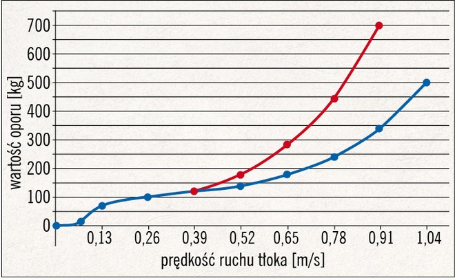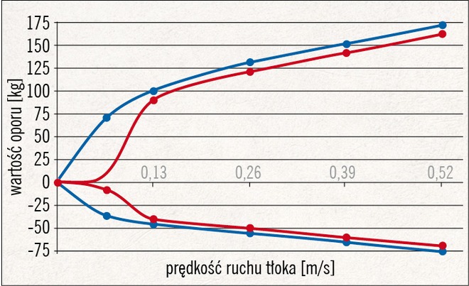Rys. 14. Zwiększenie docisku płytek sprężyną powoduje wzrost siły tłumienia przy średnich prędkościach tłoka |