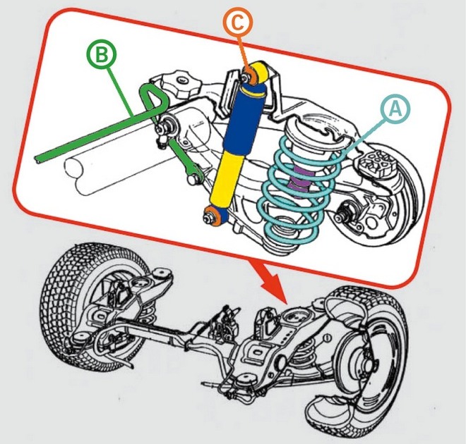 Rys. 1. Współpraca amortyzatora z elementami sprężystymi w tylnym zawieszeniu samochodu osobowego: A – sprężyna śrubowa, B – stabilizator, C – tuleje gumowe lub metalowo-gumowe |