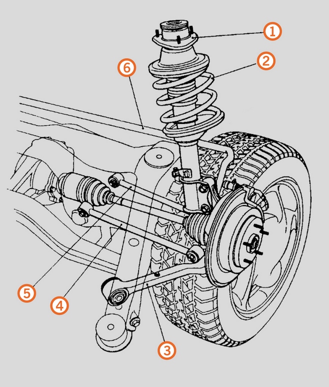 Rys. 9. Elementy sprężyste w zawieszeniu przednim typu McPherson: 1 – elastyczna podkładka górnego mocowania, 2 – sprężyna śrubowa, 3, 4, 5 – wahacze z przegubami metalowo-gumowymi, 6 – stabilizator |
