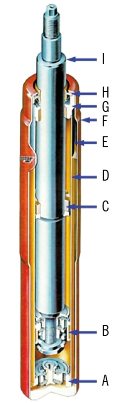 Rys. 1. Przekrój amortyzatora dwururowego: A – zawór w podstawie cylindra, B – tłok, C – odbojnik ściskania, D – cylinder, E – przestrzeń kompensacyjna z olejem (żółty) i gazem (czarny), F – korpus, G – prowadnica, H – uszczelniacz olejowy, I – tłoczysko |