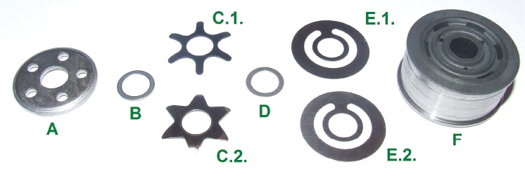 Rys. 10. Tłok dwustronny wyposażony w sprężynę gwiaździstą oraz tarczę uginaną: A – tarcza ograniczająca podnoszenie się blaszek, B – regulacyjna podkładka dystansowa, C – sprężyna gwiaździsta (można dobierać jej rodzaje różniące się sztywnością, D – podkładka regulująca wstępne naprężenie sprężyny, E – tarcza uginana, F – tłok dwustronny Emmetec |