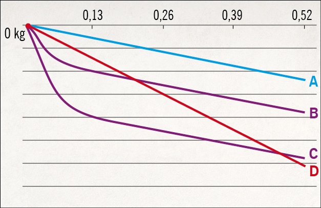 Rys. 13. Współpraca sprężyny gwiaździstej i tarczy uginanej w fazie rozciągania: A – sprężyna miękka z dwiema podkładkami niwelującymi jej wstępne naprężenie, B – sprężyna miękka z jedną podkładką i określonym naprężeniem wstępnym, C – sprężyna miękka bez podkładek, czyli z maksymalnym naprężeniem wstępnym, D – sprężyna gwiaździsta sztywna bez naprężenia wstępnego |