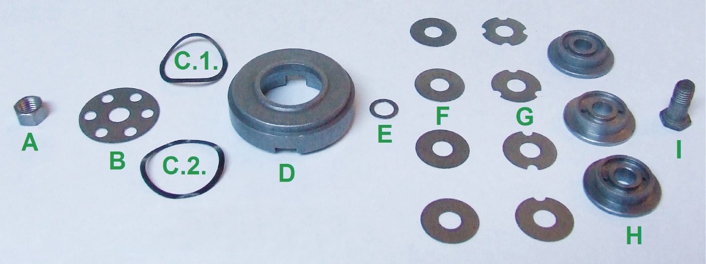 Rys. 5. Części zaworu dennego Emmetec: A. nakrętka, B. tarcza ograniczająca podnoszenie blaszek, C (1 i 2). sprężyny talerzowe, D. korpus zaworu, E. podkładka, F. blaszki pełne dostępne w różnych grubościach, G. kalibratory dostępne z 1, 2, 3 lub 4 wcięciami, H. tłoczek dostępny z 1, 2 lub 4 otworami, których liczbę można zwiększyć do 6 lub 8 dla zmniejszenia szybkości przepływu oleju