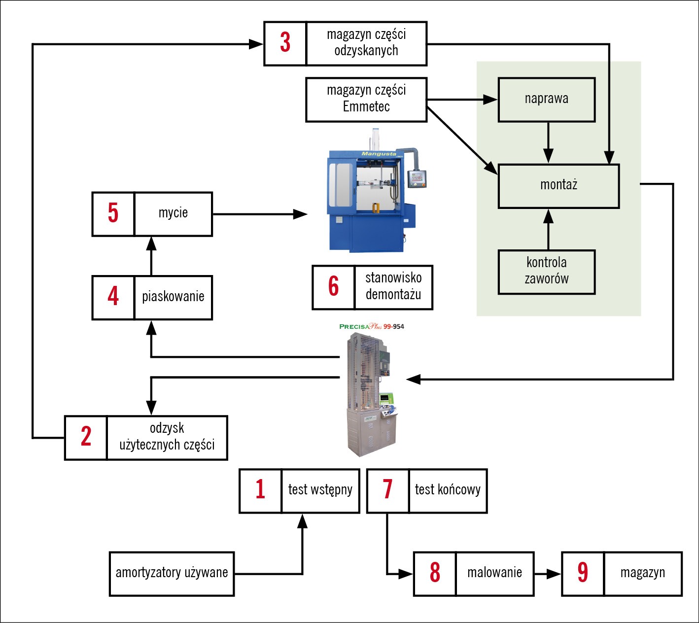 2. rozbiórka amortyzatorów nienadających się do naprawy w celu odzyskania użytecznych części (tłoczyska, cylindry wewnętrzne, zawory tłokowe, prowadnice...);