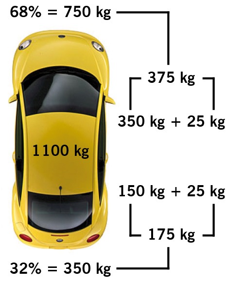 Konstruowanie wszelkich zawieszeń specjalnych poprzedzone być musi przyjęciem określonych założeń technicznych charakteryzujących właściwości modyfikowanego pojazdu. Przyjmijmy zatem, iż tworzymy sportowe zawieszenie do samochodu z napędem na przednie koła, którego masa wynosi około 1 100 kg, z czego 68% przypada na oś przednią, a 32% na tylną i jest równomiernie rozłożona na prawą i lewą stronę. Masy nieresorowane (opona, obręcz koła, piasta koła, tarcza hamulca i szczęka hamulcowa, korpus amortyzatora, itp.) to około 25 kg na jedno koło, a masa resorowana przypadająca na każde koło przednie wynosi około 350 kg, na tylne zaś – 150 kg (rys. 1). Zawieszenie przednie jest tradycyjnego typu McPherson, a więc koło, amortyzator i podkładka elastyczna mają to samo ramię dźwigni (1:1), tzn. będą zawsze wykonywały ten sam skok z taką samą prędkością (rys. 2).