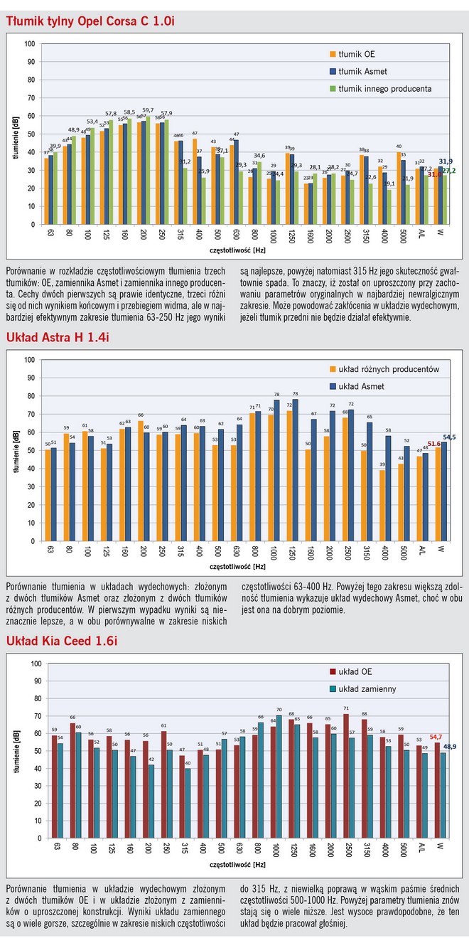 Nowy samochód przed dopuszczeniem do ruchu musi przejść w całości proces homologacji, czyli podlega między innymi kompleksowemu badaniu wpływu emitowanego hałasu na środowisko. Inaczej wygląda sytuacja, gdy w pojeździe już eksploatowanym trzeba wymienić zużyte elementy układu wydechowego, np. pojedynczy tłumik lub rurę. Jest obecnie na rynku wtórnym szeroki wybór takich części zamiennych, poczynając od wyrobów sygnowanych jako produkty OES, aż do tanich zamienników. Każdy ich producent zapewnia klienta, że jego wyroby mają parametry porównywalne z parametrami wyrobów montowanych fabrycznie. W przypadku tłumików dotyczy to – prócz stosowania odpowiedniej jakości materiałów, które decydują o wytrzymałości produktu – także konstrukcji wewnętrznej oraz zewnętrznych kształtów. Modyfikacje wprowadzane niekiedy w tym zakresie są na ogół korzystne, gdyż wynikają nie tylko z ograniczonych możliwości technologicznych, lecz także z dążenia do obniżki kosztów produkcji, a co za tym idzie – obniżenia ceny wyrobu. Takie zmiany stosują również producenci dostarczający wyroby równocześnie do pierwszego montażu samochodów i dla "aftermarketu".