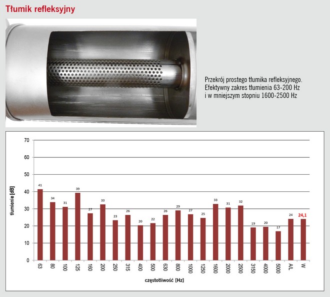 Przykłady badań porównawczych akustycznej skuteczności tłumików. Przeprowadzono je w komorze bezechowej laboratorium akustycznego Asmet z użyciem aparatury pomiarowej firmy Bruel&Kjaer. Zakres mierzonych częstotliwości w paśmie słyszalnym: 63–5000 Hz. Charakterystyka pomiaru liniowa (L), szerokość pasma 1/3 oktawy. Poziom hałasu wyrażony w decybelach (dB).