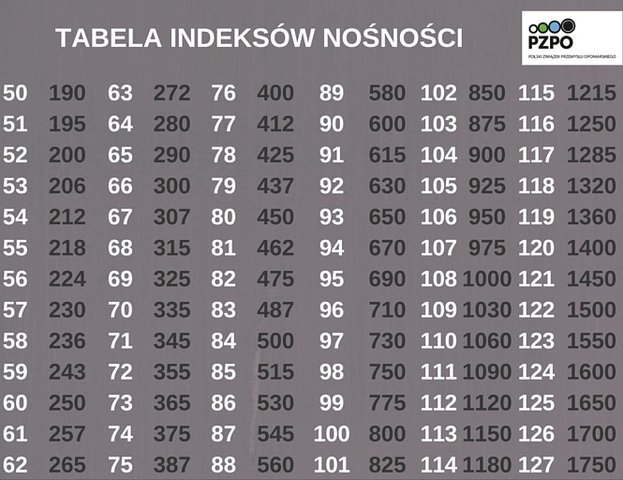 Oznaczany liczbami indeks nośności przedstawia wartość maksymalnego obciążenia jednej opony przy zachowaniu prędkości dopuszczonej przez producenta pojazdu. Wskaźnik ten wyrażany jest w kilogramach.