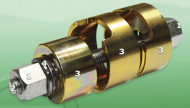 Pierwsza z nich odpowiada wymiarom cylindrycznego otworu, druga zaś stanowi kielich otaczający ten otwór swym obrzeżem. Przez dokręcanie śruby pociągowej wywierany jest nacisk na zewnętrzną część przegubu, powodujący jego stopniowe wysuwanie z otworu. Część już wysunięta wchodzi dość luźno do tulei kielichowej, a podłużne wycięcia w jej bocznych ścianach pozwalają śledzić przebieg tej operacji.