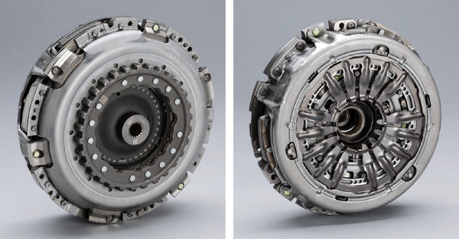 Podwójne sprzęgło suche: z lewej – widziane od strony silnika, z prawej – od skrzyni biegów