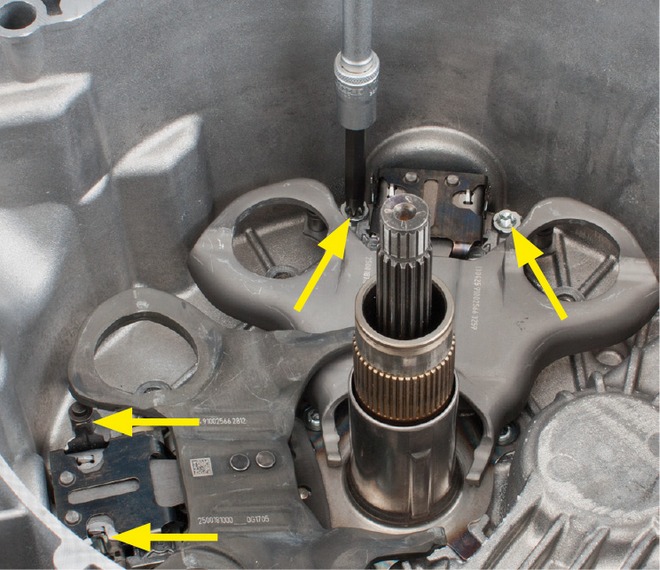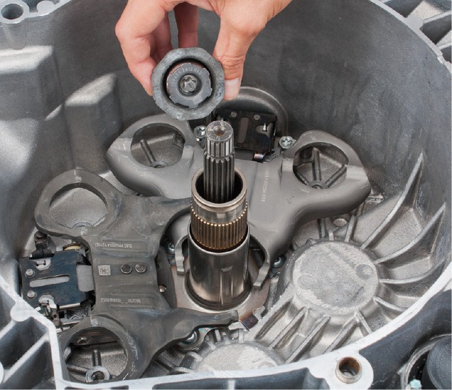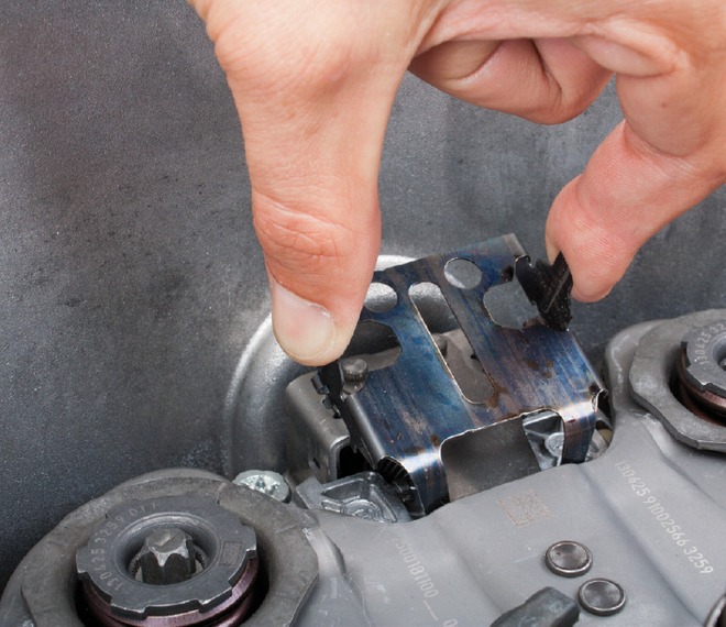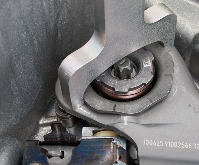 Wszystkie nowe podwójne sprzęgła do Renault ze skrzyniami biegów DC4 nie wymagają dodatkowych prac przed ich instalacją, ponieważ są wyposażone w blokady transportowe. Jeśli wcześniej wymontowane sprzęgło ma być ponownie użyte (na przykład, gdy naprawa dotyczyła tylko uszczelnienia skrzyni biegów), blokada transportowa musi znów zostać odpięta. Do tego celu należy zastosować zestaw narzędzi numer 400 0425 10 (fot. 5).