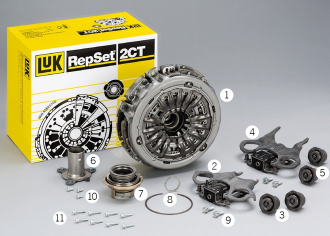 Zestaw naprawczy LuK RepSet 2CT oferowany przez Schaeffler Automotive Aftermarket (fot. 2) zawiera wszystkie elementy potrzebne przy wymianie podwójnego sprzęgła suchego. Są one dokładnie dopasowane do siebie fabrycznie, co eliminuje ewentualne problemy montażowe. Równocześnie z podwójnym sprzęgłem powinien zostać wymieniony układ zasprzęglania, ponieważ on także ulega eksploatacyjnemu zużyciu.