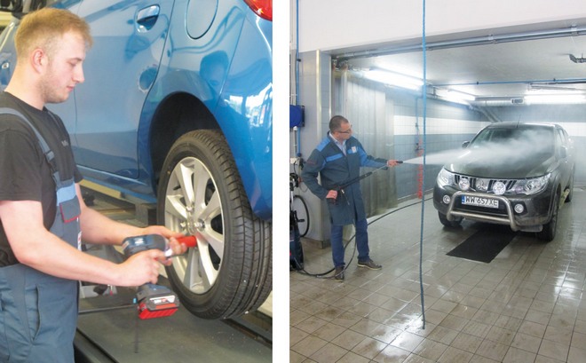 Z lewej: Akumulatorowy klucz udarowy z powodzeniem zastępuje podobne narzędzie pneumatyczne; Z prawej: w warunkach serwisu Mitcar można było wypróbować także myjki ciśnieniowe