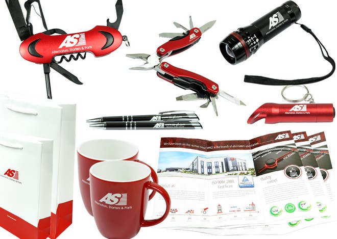 Wśród oferowanych produktów znajdują się m.in. zestawy narzędzi, torby papierowe w trzech rozmiarach, teczki, notatniki i ulotki o firmie AS.