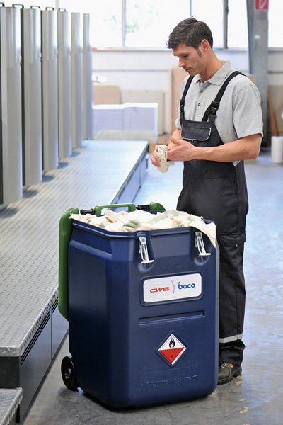 Należą do nich tekstylne czyściwa przemysłowe oraz maty pochłaniające olej. Dzięki specjalnej, siatkowanej strukturze czyściwa są niezwykle chłonne, można nimi czyścić narzędzia oraz maszyny zabrudzone smarami, olejami czy innymi tłustymi cieczami. W ofercie znajdują się również takie, które dobrze sobie radzą z usuwaniem drobnych opiłków metalu. Czyściwa trafiają do klienta w mobilnych kontenerach do przechowywania, co zapewnia bezpieczne składowanie i transport. Hermetycznie zamykane klapy pojemników blokują wydostawanie się oparów rozpuszczalników i olejów, redukując ryzyko samozapłonu w pomieszczeniu, w którym się znajdują.