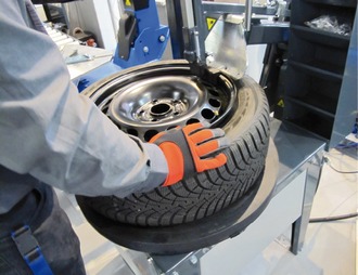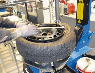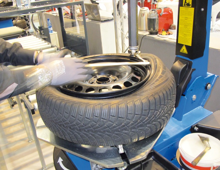 Na tej samej montażownicy zakładane są nowe opony dostarczone na uniwersalnym ośmiobocznym wózku |