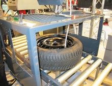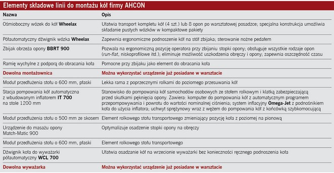 Końcowym etapem obsługi zmontowanego koła jest, jak zwykle, jego wyważenie. W systemie Ahcon do wyważarki dociera ono po rolkach transportowego stołu, którego ostatni odcinek jest nachylony ku dołowi pod kątem 45 stopni. To sprawia, iż koło pod własnym ciężarem obraca się do pozycji pionowej i opiera o półautomatyczny dźwignik, samoczynnie podnoszący je do takiej wysokości, by otwór środkowy felgi znalazł się na poziomie wrzeciona maszyny. Wówczas wystarczy obręcz wycentrować za pomocą odpowiedniego stożka i dociskowej nakrętki. Koła już wyważone trafiają na ośmioboczny wózek, którym są odstawiane na miejsce magazynowania lub montażu w pojeździe.
