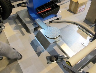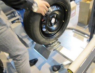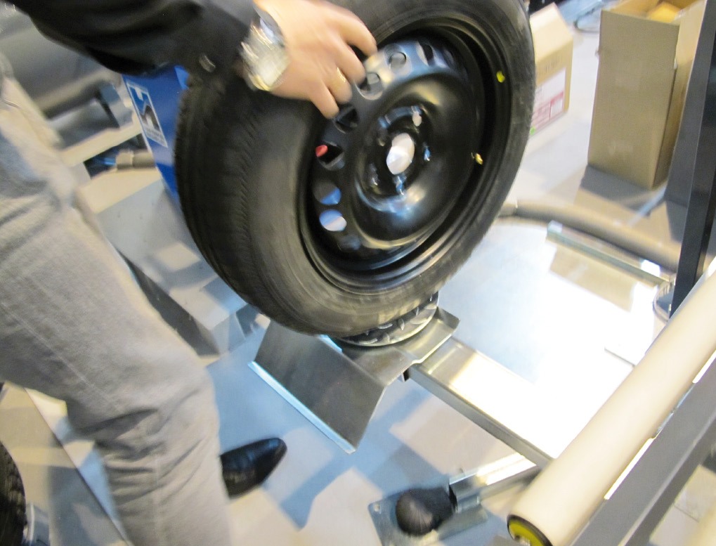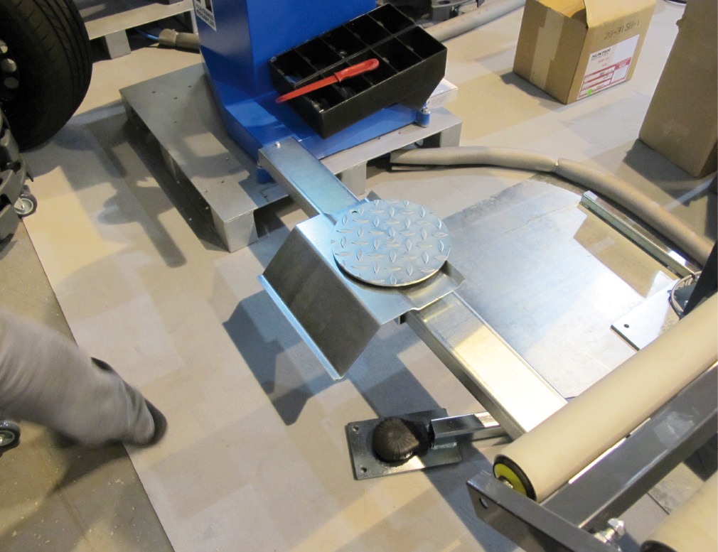 Demontowane koło przesuwane jest po rolkach ze zbijaka na dowolną montażownicę (tu model wymagający pomocy tradycyjnej łyżki) |