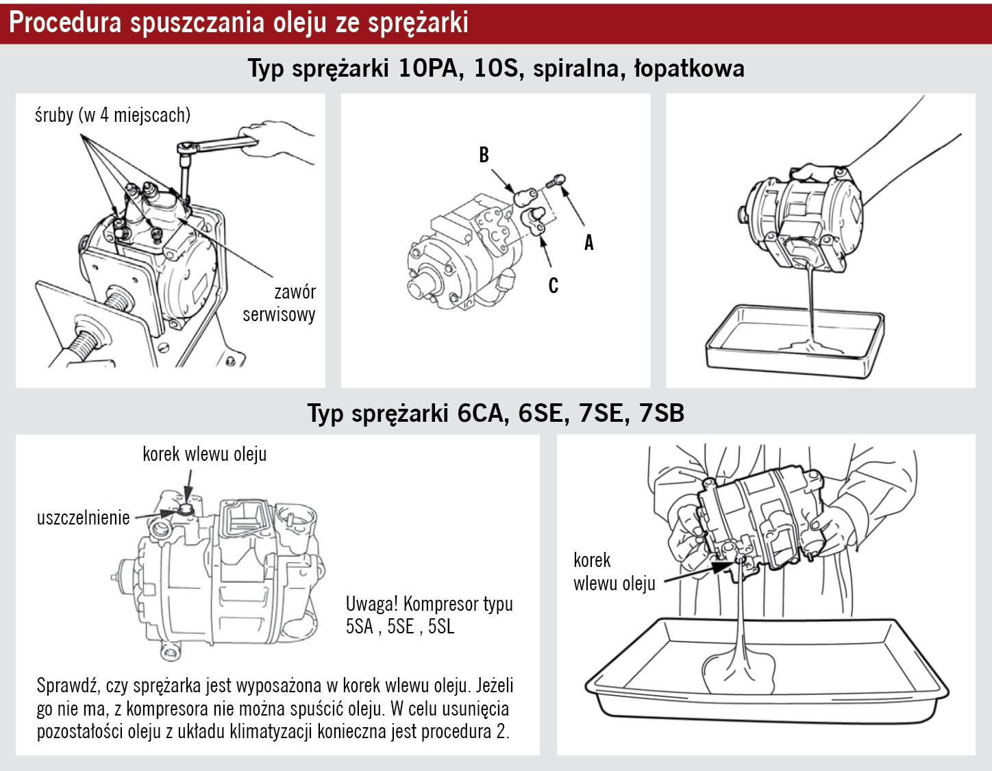 Po wymontowaniu sprężarki trzeba spuścić z niej olej i również zmierzyć jego ilość. Procedury opróżniania sprężarek są podawane w instrukcjach ich montażu.